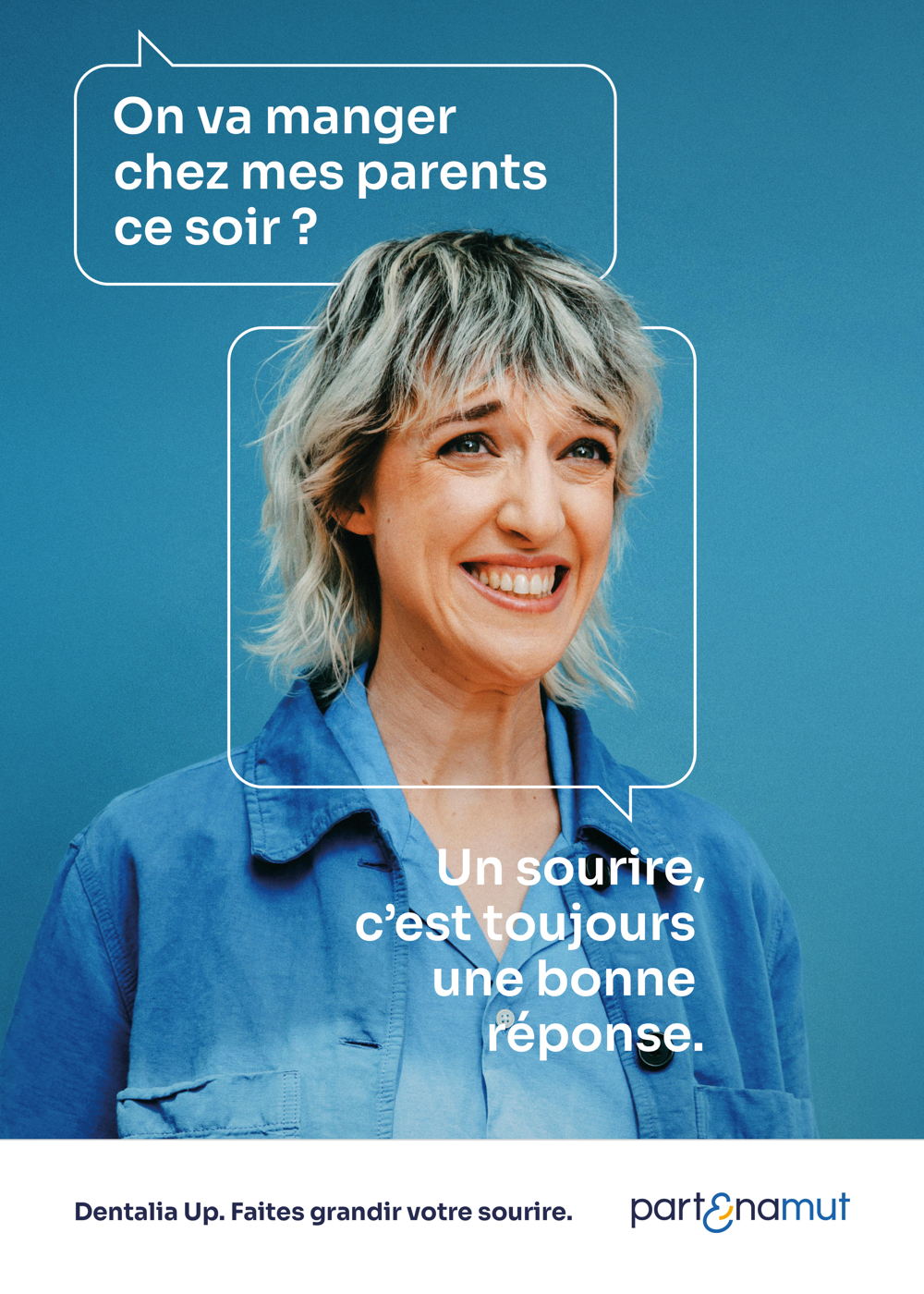 Een campagne vol smiles dus, maar niet de perfecte glimlachen die je in elke tandverzekeringscampagne ziet. Die van Air en Partenamut staan dichter bij onze dagelijkse realiteit: een verlegen en ongemakkelijke glimlach, een schuldige, nerveuze, gestreste of bezorgde glimlach ... En het zijn al deze verschillende glimlachen die Dentalia Up groter maakt, om de verschillende momenten van het leven vol vertrouwen tegemoet te zien.